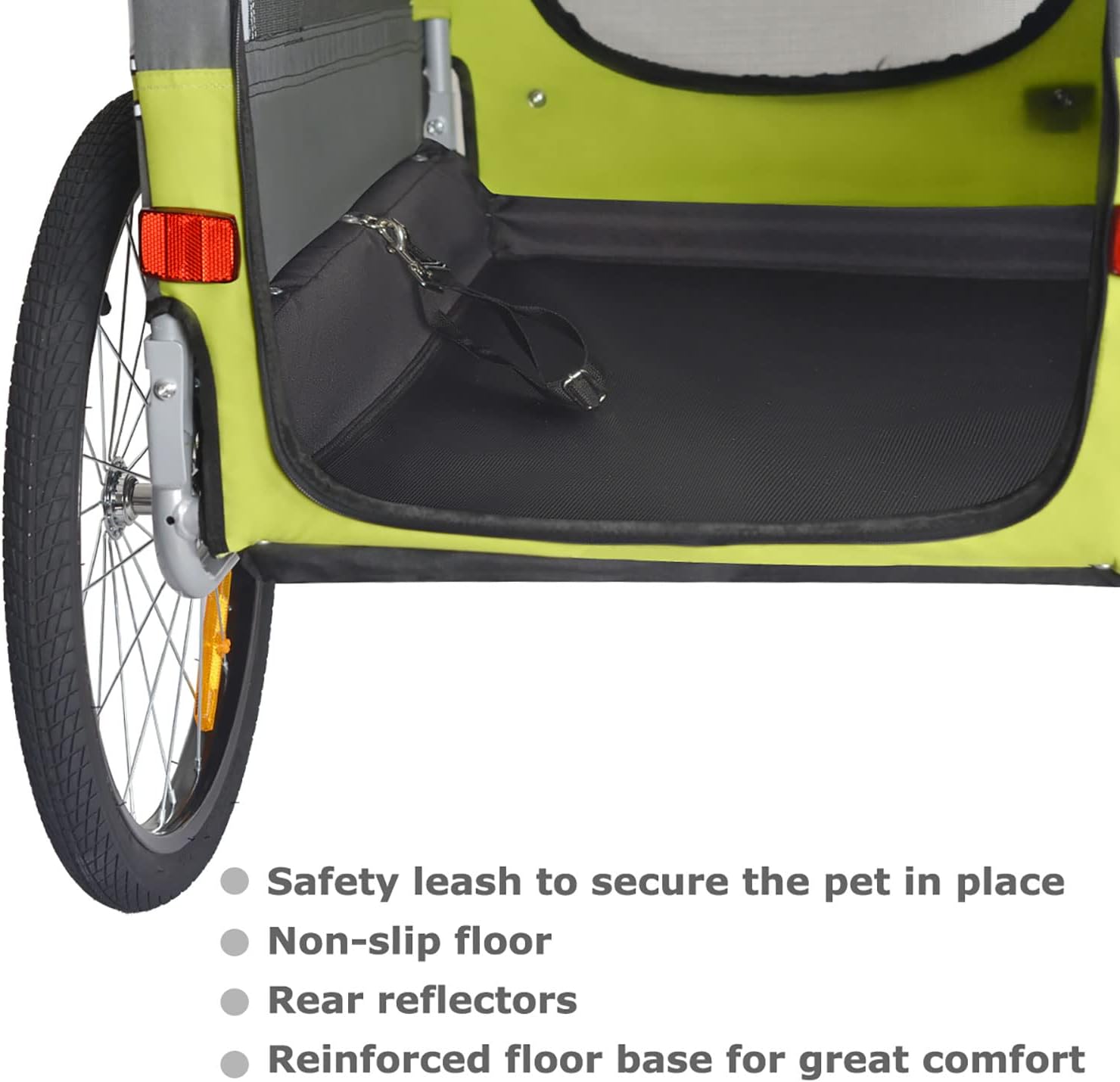 • Adjustable safety leash keeps pets secure while riding.